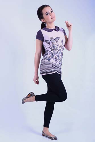 Изысканная молодежная туника прилегающего силуэта из купонного трикотажного полотна. Горловина с отложным воротником. Воротник украшен декоративным элементом со стразами